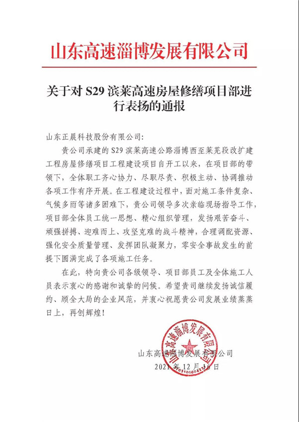 近日,赢博app官方在线入口承建的S29滨莱高速公路淄博西至莱芜段改扩建工程房屋修缮项目获得业主表扬!